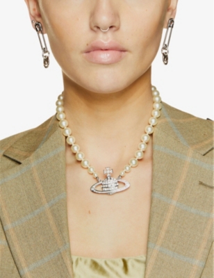 A definitive star of the show is the Vivienne Westwood orb necklace. The iconic orb logo of the label is celebrated in dangling charms of varying dimensions. Different versions are encrusted with glittering crystals set in gold-toned brass; shining with platinum and cubic zirconia; or outlined in gleaming silver tones with a shimmering pearl at the centre. Each embodies the orb imagery Westwood created in the 1980s, inspired by royal insignia encircled by a futuristic satellite ring like Saturn's.