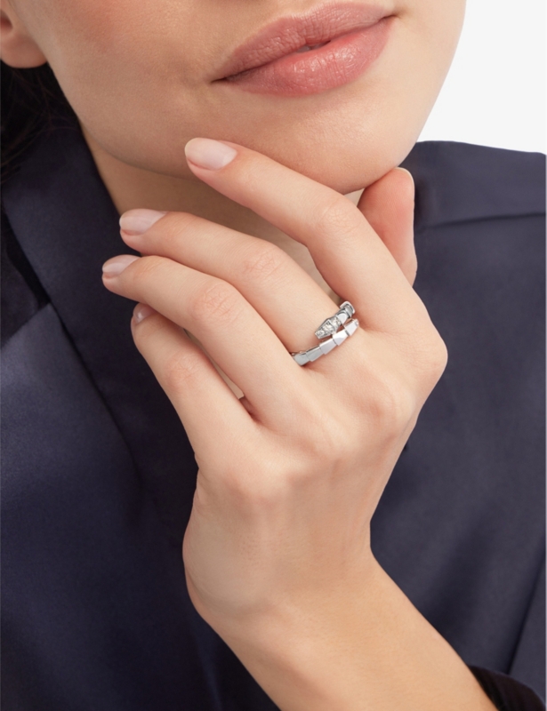 - Polished finish, wrap-around two-coil silhouette, pavé setting