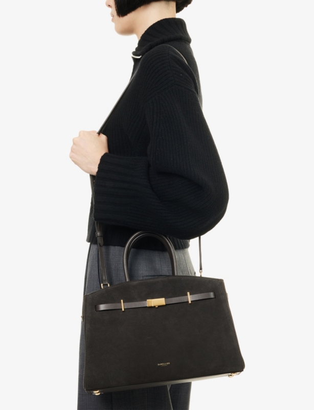 - Flat top handle, detachable strap, rectangular silhouette, flap closure, one main compartment, interior zipped pocket