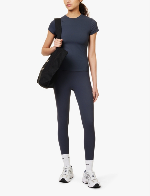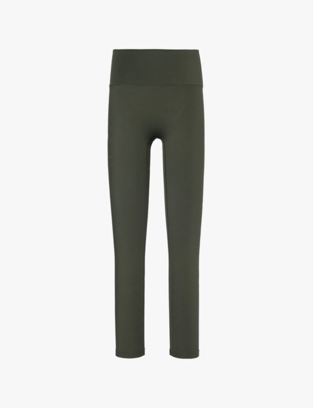 - Slim fit, high waist, seamless at front, brand text print at back, four-way stretch, designed for low-impact movement and everyday wear