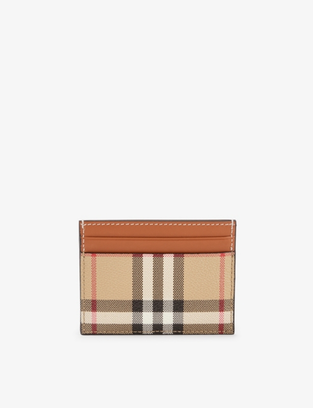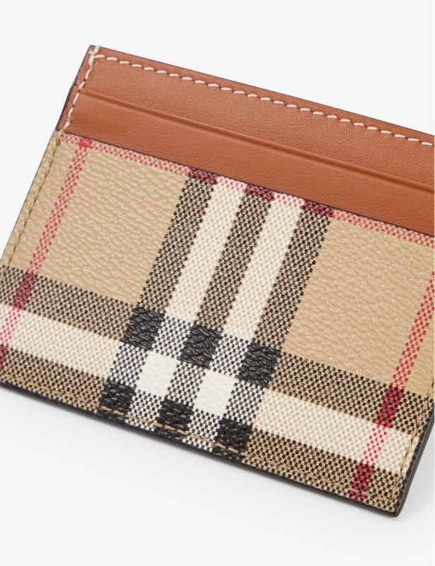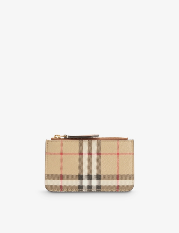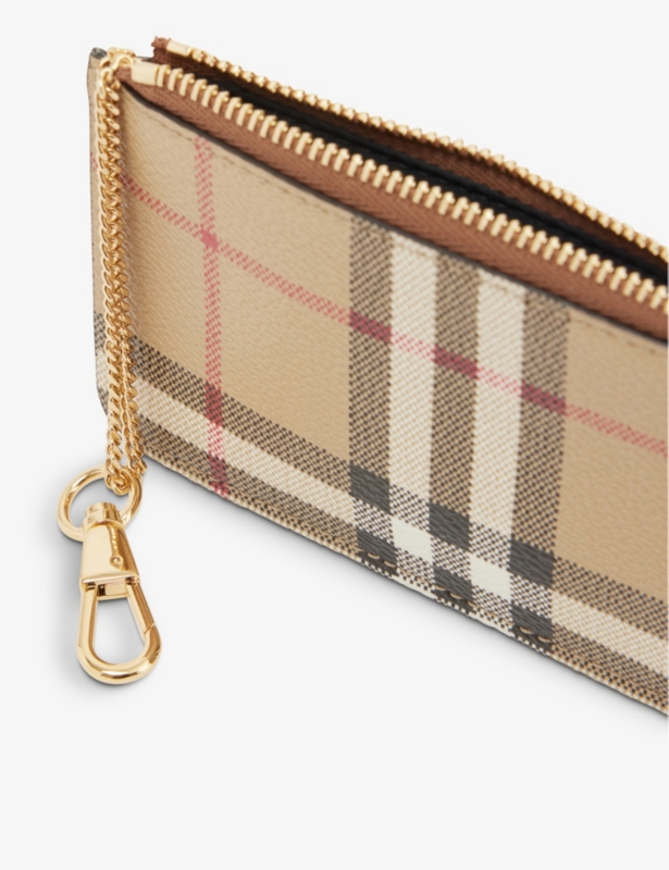 - Rectangular shape, engraved branding plaque at flap front, slip pocket at back, all-over check print, texture, leather trims, gold-toned hardware, one main compartment, internal zip pocket and three slip pockets, six internal card slots and foiled branding, fully lined