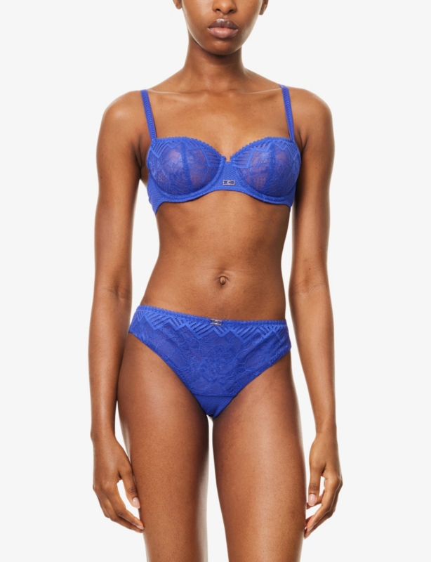 <li>Adjustable shoulder straps, floral lace at cups, soft cups, bow with gold-toned branded hardware at front, underwired, mesh wings, scalloped trims, nude mesh lining