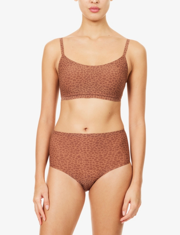 - Mid rise, elasticated waistband, all-over leopard print, low coverage at back, lined gusset