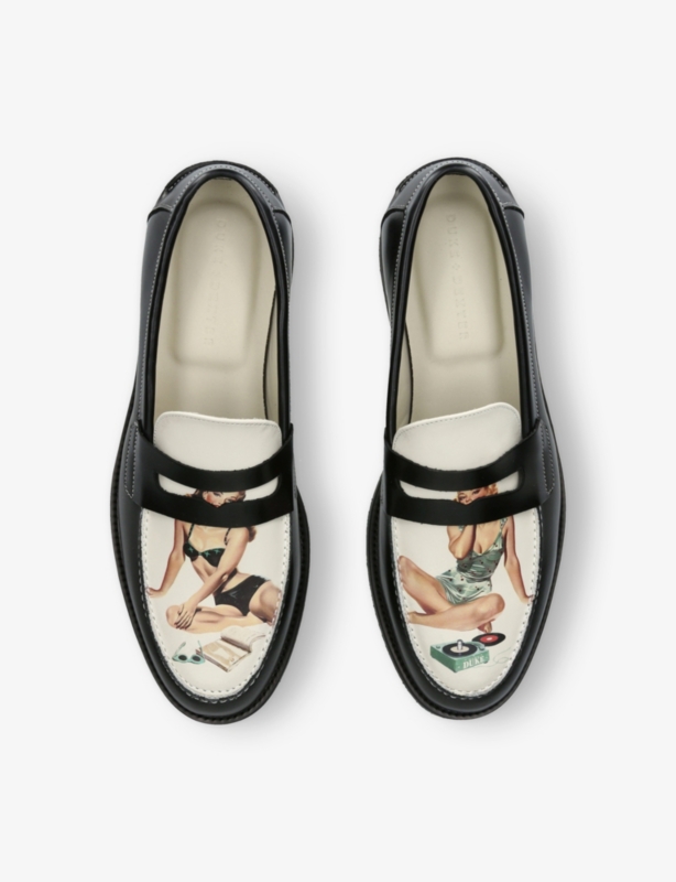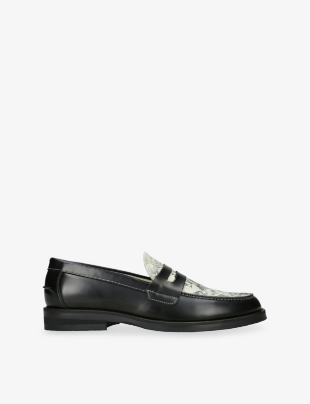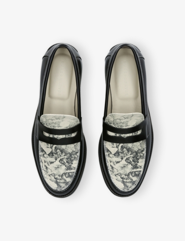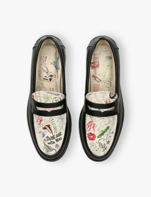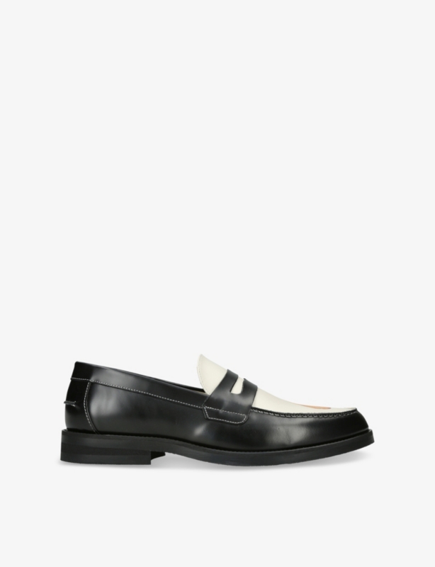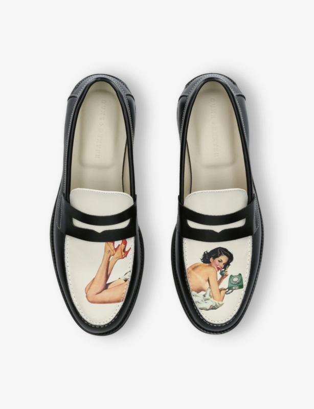 - Almond toe, apron stitching, penny strap on front, stacked heel