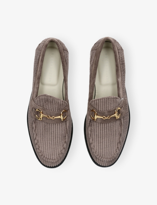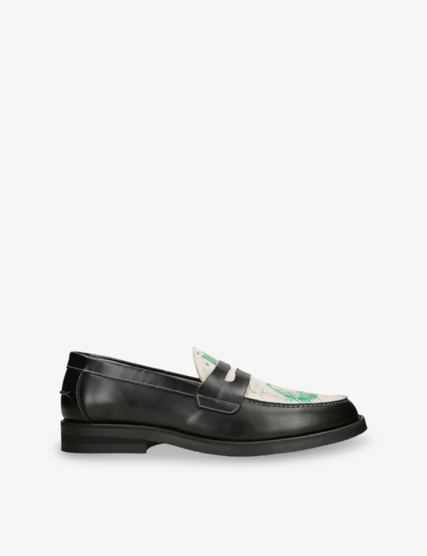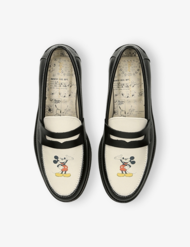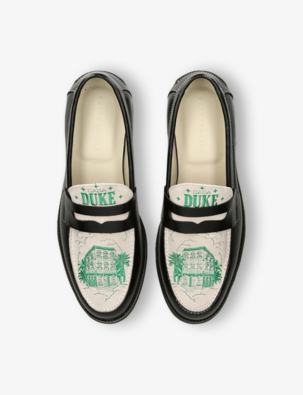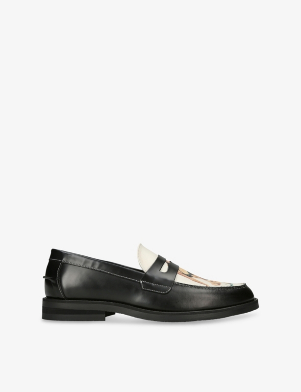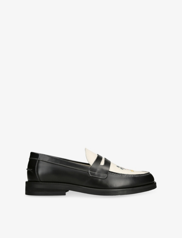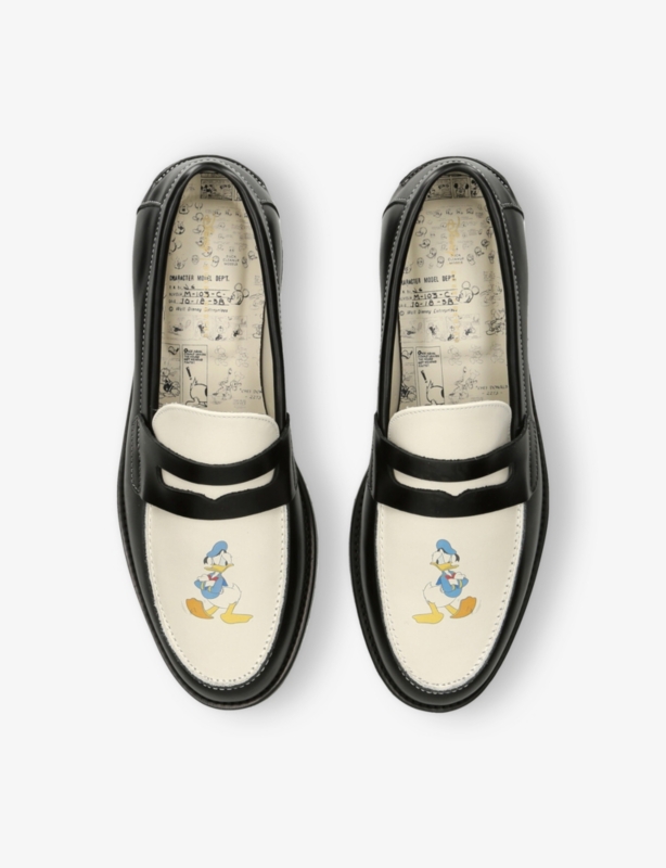 - Almond toe, apron stitching, penny strap on front, stacked heel