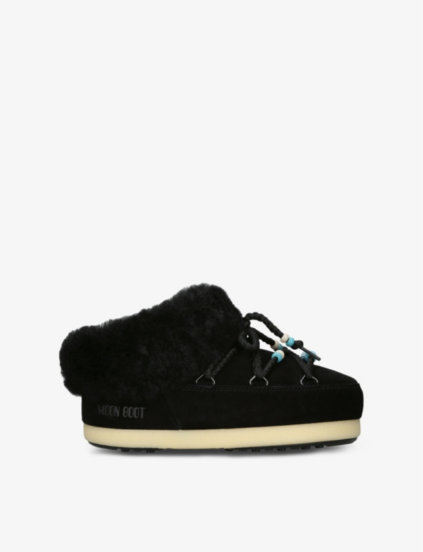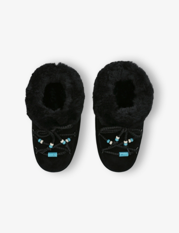- Rounded close toe, eyelets at front, tonal laces, ankle-length, padded collars, brand embossed around the front, faux-shearling at interior, gripped soles