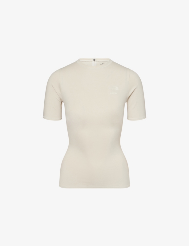 - Slim fit, round-neck, short sleeves, embossed brand print at front and back, flared hem