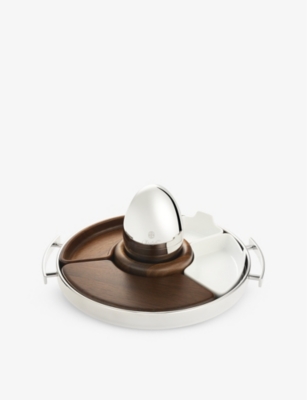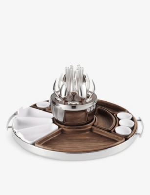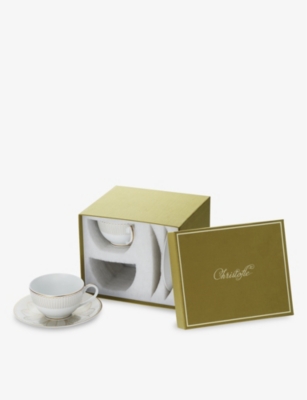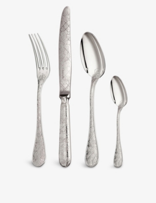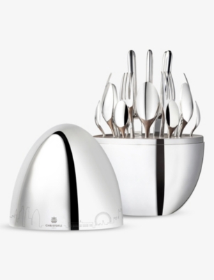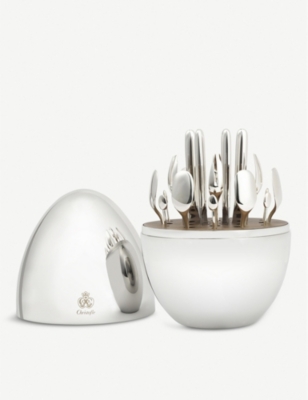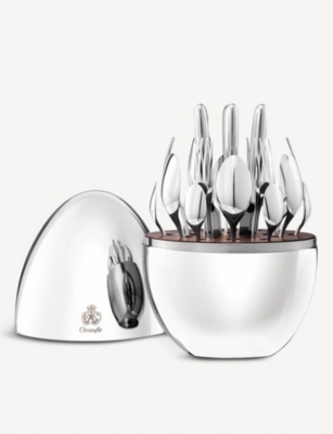 Explore our collection of Christofle silverware and admire sets of stainless-steel cutlery with branded embellishments adorning some items - keep an eye out for initials, lettering and trademark scales that tell you it's a Christofle. Everything is beautifully presented in tasteful storage capsules and boxes.
