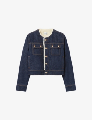 Contrast-Collar Double-Breasted Cropped Denim Jacket- Discount price:$215.00