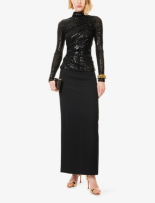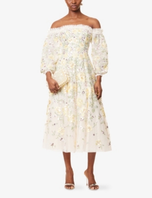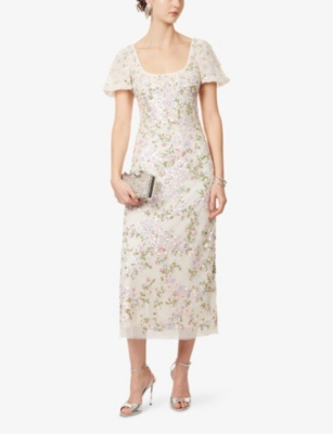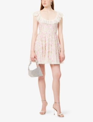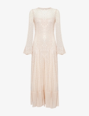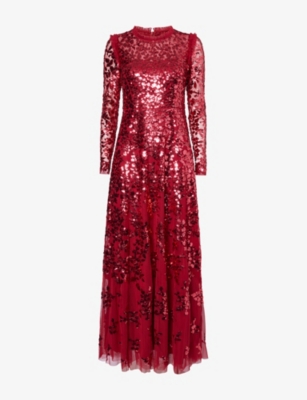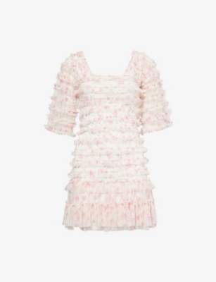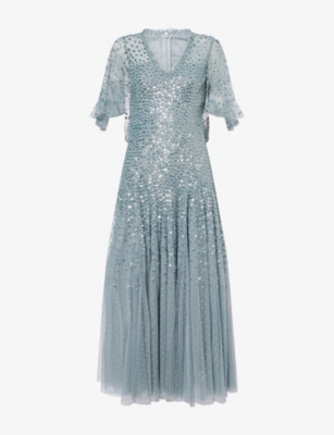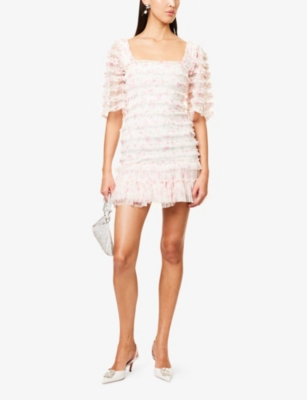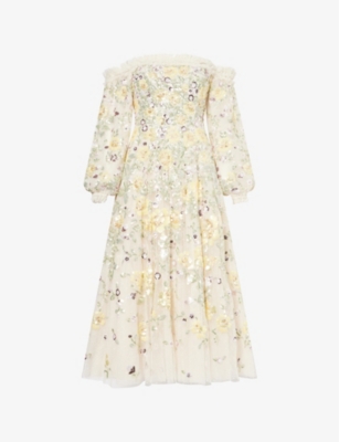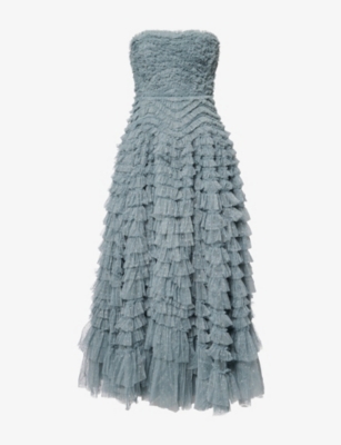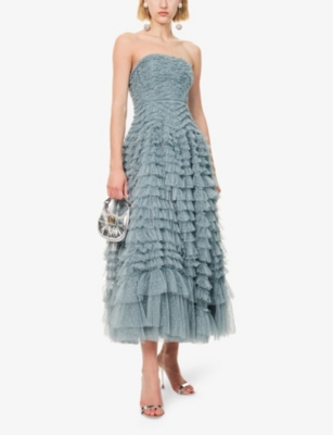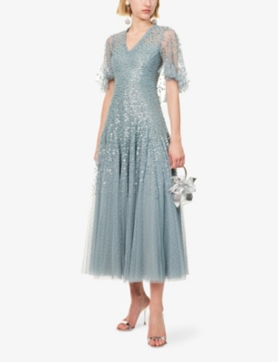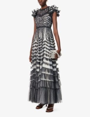 In our selection by Needle & Thread, you'll find dresses made from hand-printed tulle that tumbles in multi-layered skirts and ruffled maxi dresses. Glittering sequins applied to gauzy fabrics float into weightless flared midi skirts and fanciful A-line minis. Decorative flourishes add extra opulence to breezy silhouettes: think frilled trims and semi-sheer panels. Look out for a range of necklines to suit your preference, from plunging Vs and softly rounded collars. Sleeves are delicate and flattering: think short bell and flute shapes, half-capped styles and full-length items. Sleeveless and backless options are just right for wearing to cocktail parties.