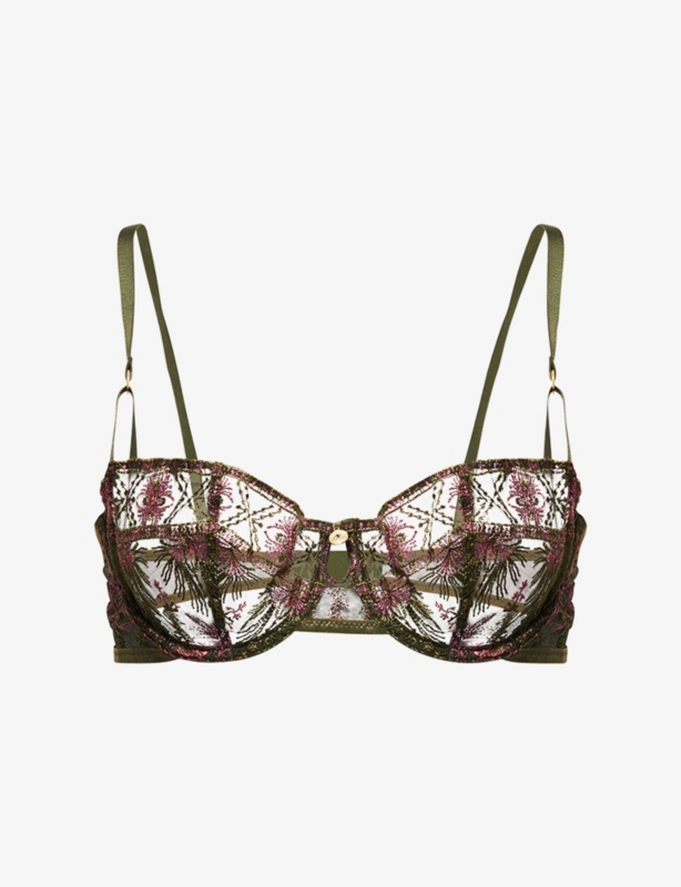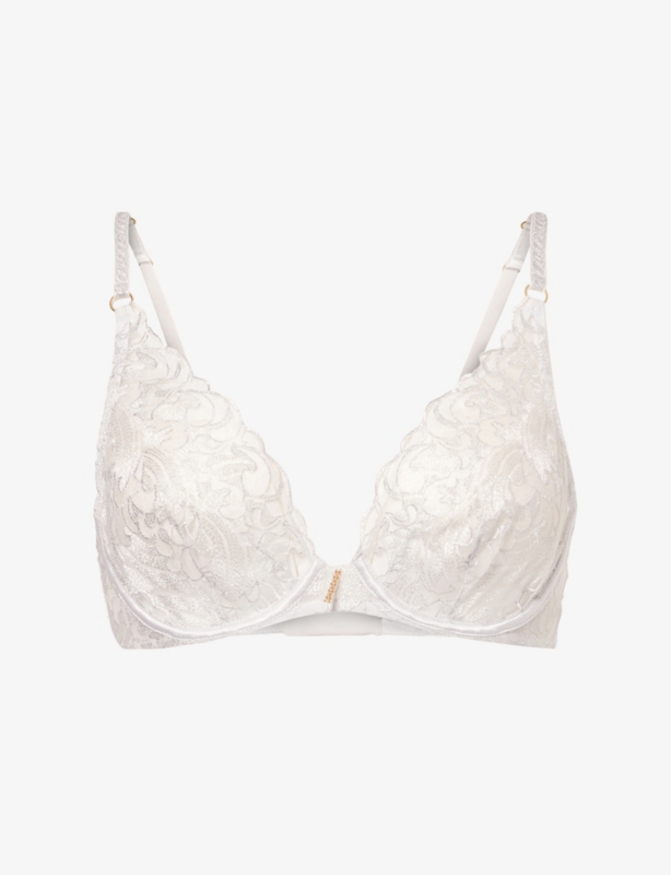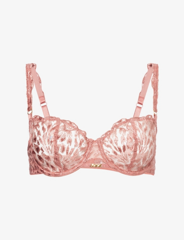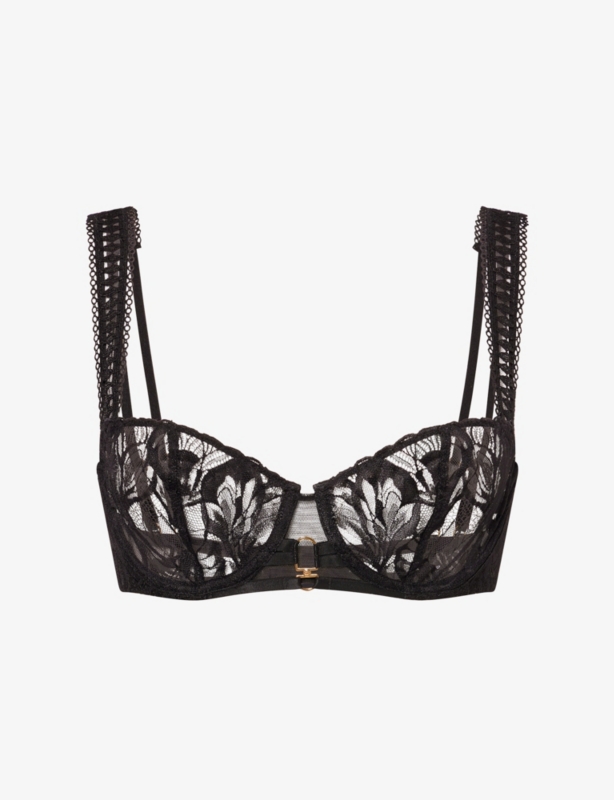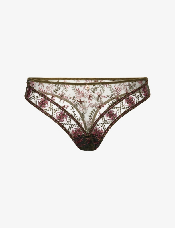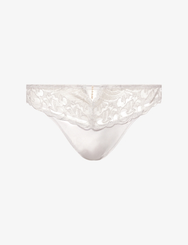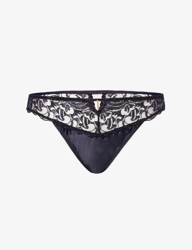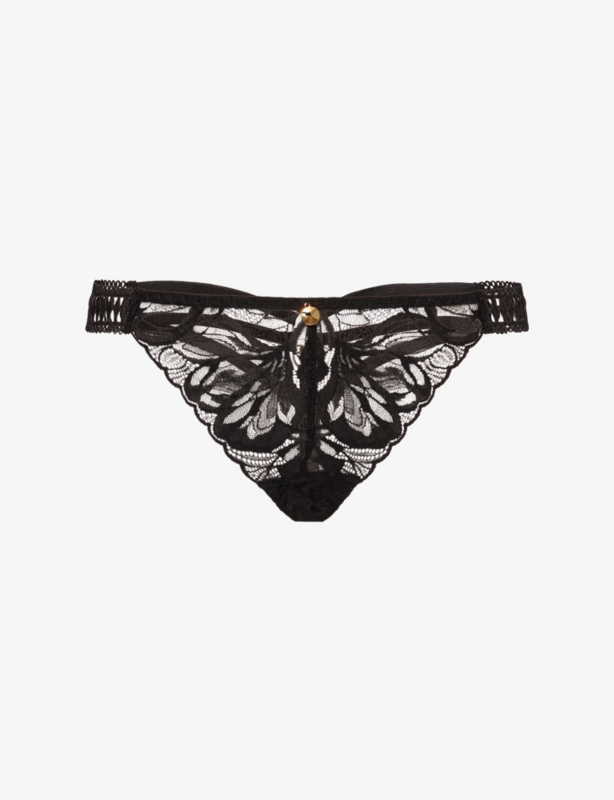 - Tanga shape, mid-rise, elasticated waistband, crystal-embellished brand plaque at waistband, sheer lace, low coverage at rear