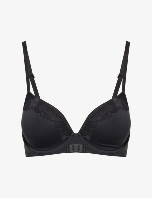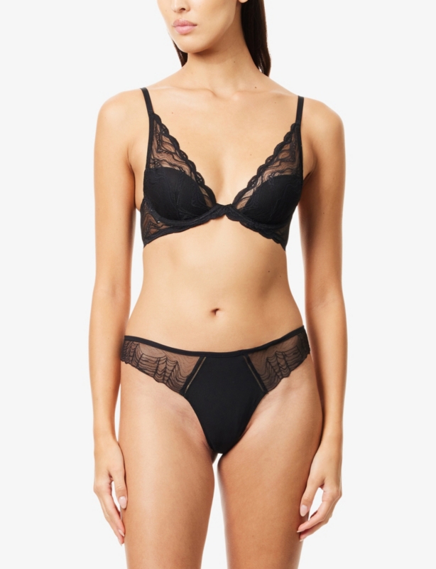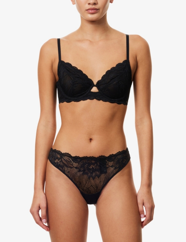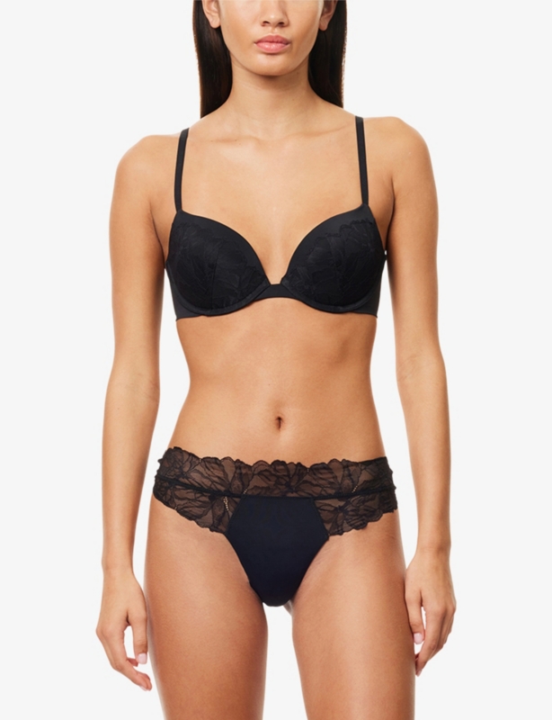- Mid-rise, elasticated waistband, seamless, semi-sheer lace trim at waist, brand print at front, full-coverage at back, lined gusset