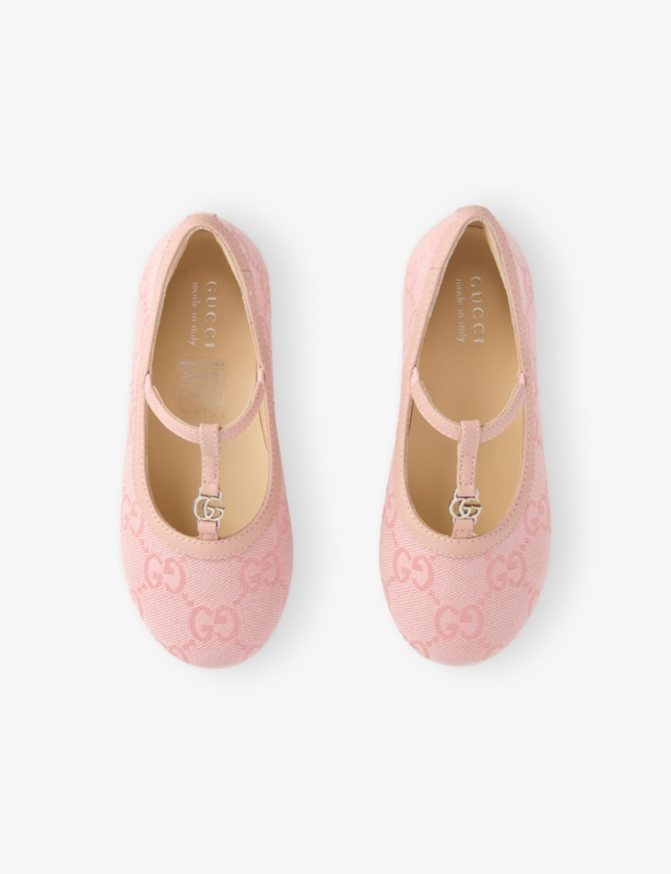 - Closed round toe, elasticated front strap, bow at strap, pull tab at heel, signature red sole