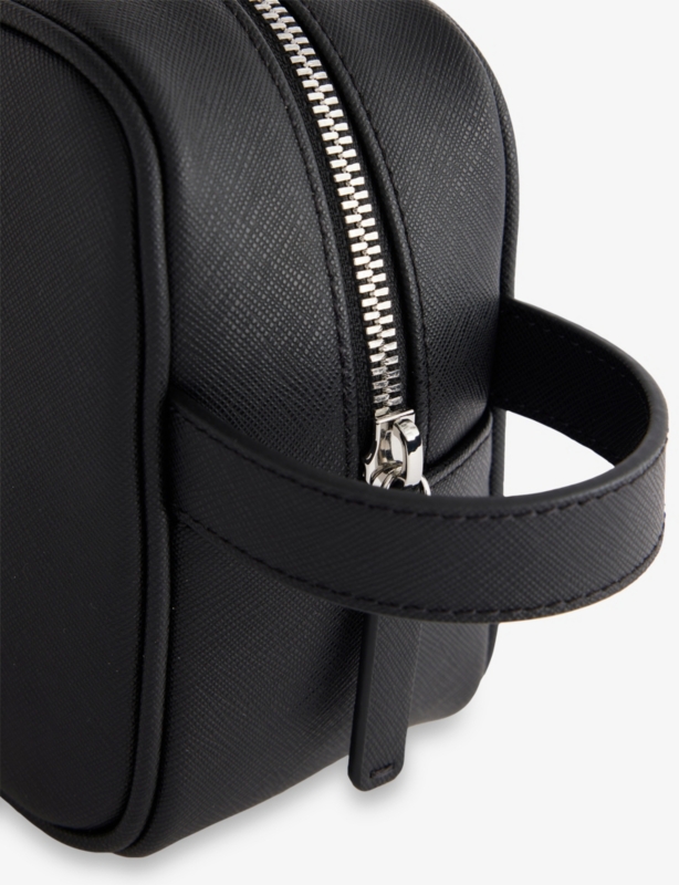 - Metal brand plaque at exterior, four card slots, currency compartment and coin compartment at interior, debossed branding at interior, textured
