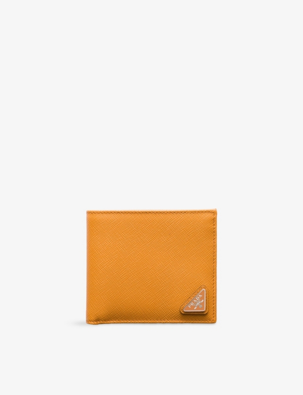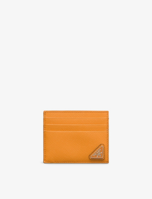 - Rectangular shape, triangle logo plaque at corner, silver-toned hardware, six interior card slots, Saffiano leather, metal money clip