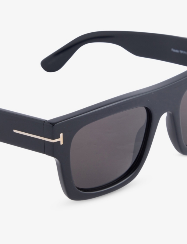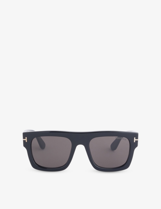 - Square frame, gold-tone metal at temples, embossed logo at lens, 100% UV protection
